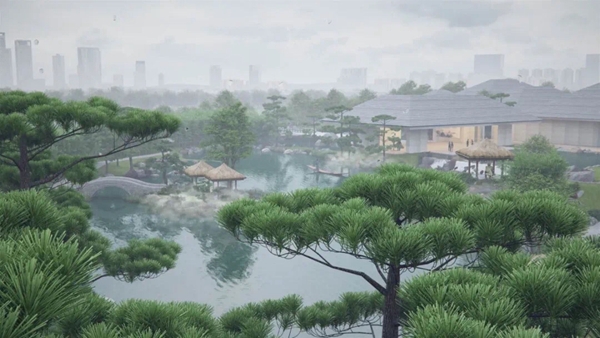 景观设计深入挖掘张大千造园的画意根源,经松、竹、水、石为主要造景元素,融入张大千喜爱的成都本土植物,展现张千山水画境。设计五亭湖畔重现黄山云石、长松径、踯躅屿、分寒亭、灵池等八德园经典景点,形成全景展示大千山水文人画意的立体画卷,抒发园林超然的古雅之美、虚静之美和清旷之美,充分表达大千的思乡情绪。