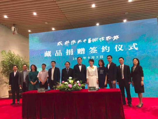 2019年9月5日,成都张大千艺术博物馆藏品捐赠签约仪式在成都博物馆举行。来自宝岛台湾的孙凯先生,是张大千先生入室弟子孙云生之子,自幼陪伴在张大千身边,随之辗转巴西、日本、美国及中国台湾等地。在大千120周年诞辰之际,他出于爱国情怀和传承使命,向成都市政府捐赠张大千画作及物品,并共同筹建成都张大千艺术博物馆。孙凯捐赠的张大千物品与画作共计645件,涵盖大千各个时期的作品,其中包括被张大千称为“无价”的粉本384件,可一窥大千思想情感与生活痕迹的书信、印章、文房物品等共227件,更有珍贵的绘画及书法作品、珂罗版收藏品、绘画复制品等数十件。捐赠仪式上,四川省文化和旅游厅副厅长、四川省文物局局长王毅曾表示:“数量颇丰的藏品,独一无二的设计,成都张大千艺术博物馆将成为我省乃至全国最重要的文旅新地标!。”