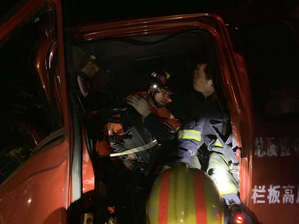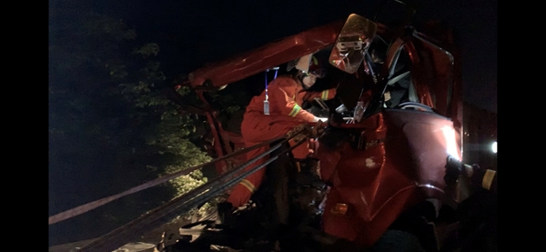 8日晚23时45分,泸州市江阳区黄舣镇往成都方向高速路上两车追尾,由于其中一辆货车驾驶室变形,导致一男驾驶员被困,泸州市消防救援支队119指挥中心接到报警后,立即调派海普路消防救援站出动1台抢险救援车,1台水罐消防车及8名消防队员火速赶赴现场开展救援。