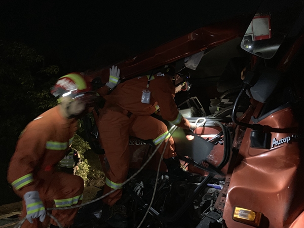 在这样的紧急情况下,3名消防员用绳索工具先对货车的车头进行固定,再利用抢险救援车的牵引绳将其拉开,从而营造足够的救援空间。经过10分钟的紧急救援,被困人员被安全救出,并移交给现场医护人员救治。目前,此次事故的原因正在调查中。