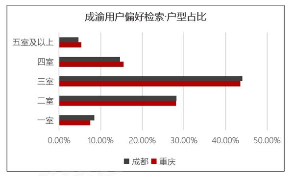 据58同城、安居客《2020成渝经济圈购房轨迹报告》显示,成都购房者在置业时对二室、三室、四室倾向占比分别为28.24%、44.01%、14.66%;重庆分别为28.12%、43.59%、15.49%。成渝购房者置业时均青睐三室,其次是二室。不过重庆购房者对于四室及以上户型青睐度高于成都地区,三室及以下户型低于成都购房者,重庆购房者更倾向于开阔的大户型。