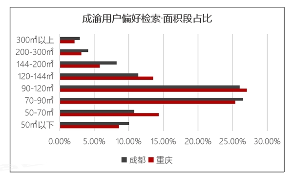 四川在线消息(记者 文强)4月9日,58同城、安居客发布《2020成渝经济圈购房轨迹报告》显示,成渝购房者最喜欢总价为150万元以下,70-120㎡之间的房源。其中,重庆购房者最青睐90-120㎡的房源,成都购房者最青睐70-90㎡房源。另外,成都购房者对于50㎡及以下和144㎡及以上面积段偏好占比均略高于重庆购房者,体现出成都置业者对于面积偏好的两级分化态度。