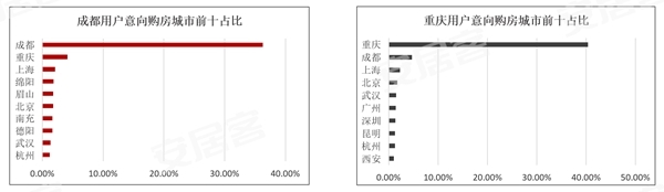 调查显示,购房者意向城市前十中,成渝购房者置业时选择意向城市均主要集中在成都、重庆、上海。不过,重庆购房者意向置业城市向外扩较多,主要偏好成都、西安、昆明等西部城市和北上广深等一线城市。而成都购房者意向城市内聚较多,主要集中绵阳、眉山、南充、德阳等四川省内。