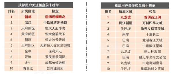 报告显示最受关注度楼盘前十榜单中,成都和重庆备受关注的楼盘分别为润扬观澜鹭岛、首创西江阅。值得一提的是,受重庆科学城选址、高新区成立影响,重庆西区关注度高,前十榜单中占5盘。受品牌效益影响,购房者更青睐品牌房企,成都购房者关注度前十楼盘中,恒大楼盘占4盘。