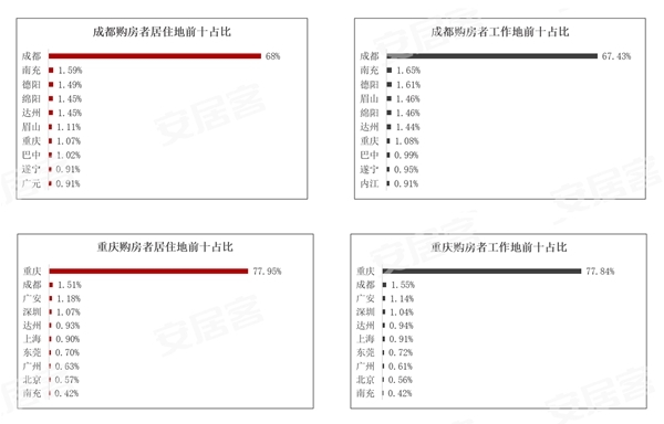 与此同时,58安居客房产研究院还对用户轨迹进行了追踪,成都购房者居住地和工作地前十均主要集中在四川和重庆,为地缘性客户,尤其是成都周边城市。其中68%的购房者居住在成都,1.07%的购房者居住在重庆;67.43%的购房者工作在成都,1.65%的购房者工作在重庆。重庆购房者居住地和工作地前十均主要集中在北上广深、四川和重庆。其中77.95%的购房者居住在重庆,3.17%的购房者居住在北上广深;77.84%的购房者工作在重庆,3.12%的购房者工作在北上广深。