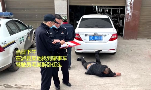 接到报警后,泸州交警兵分两路,一路查看监控,一路沿该车辆行驶路线进行追捕。15时20分,民警在50公里外的泸县一门市前找到驾驶员及车辆,当时驾驶员毛某正醉卧街头。随即,民警带毛某进行血检,血检结果为184.3mg/100ml,属于醉酒驾驶!