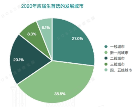 2020年春招季,疫情导致人员流动大幅下降,给大城市应届生的返校和求职带来明显影响。BOSS直聘研究院数据显示,2020年春招季,新⼀线城市吸引了38.5%的应届生,较2019年同期再次提升,超出一线城市11.5个百分点,首选一线城市发展的应届生比例有4.7个百分点的回暖,但已经是连续第二年低于30%。
