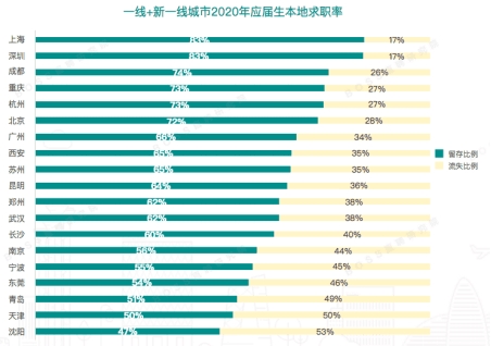 把本地高校培养的毕业生留在本地工作,是各地“抢人大战”中的重要目标之一。BOSS直聘研究院数据显示,截至3月底,上海应届生的本地求职率达到83%,领跑全国,成都、重庆、杭州应届生的本地求职率位列新一线城市三甲。