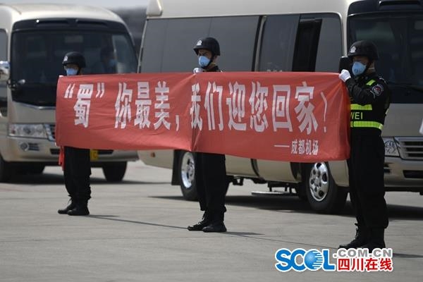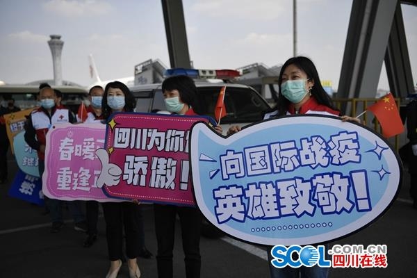 下午1点30分,5名专家首批走下舷梯,早已等候在此的迎接人员将鲜花递到他们手中。“蜀你最美,我们迎您回家”“春风十里不如你,灿烂笑容凯旋归”“人道外交,不负使命”双流机场的工作人员举着各式的自制标语,欢迎援外抗疫英雄归来。