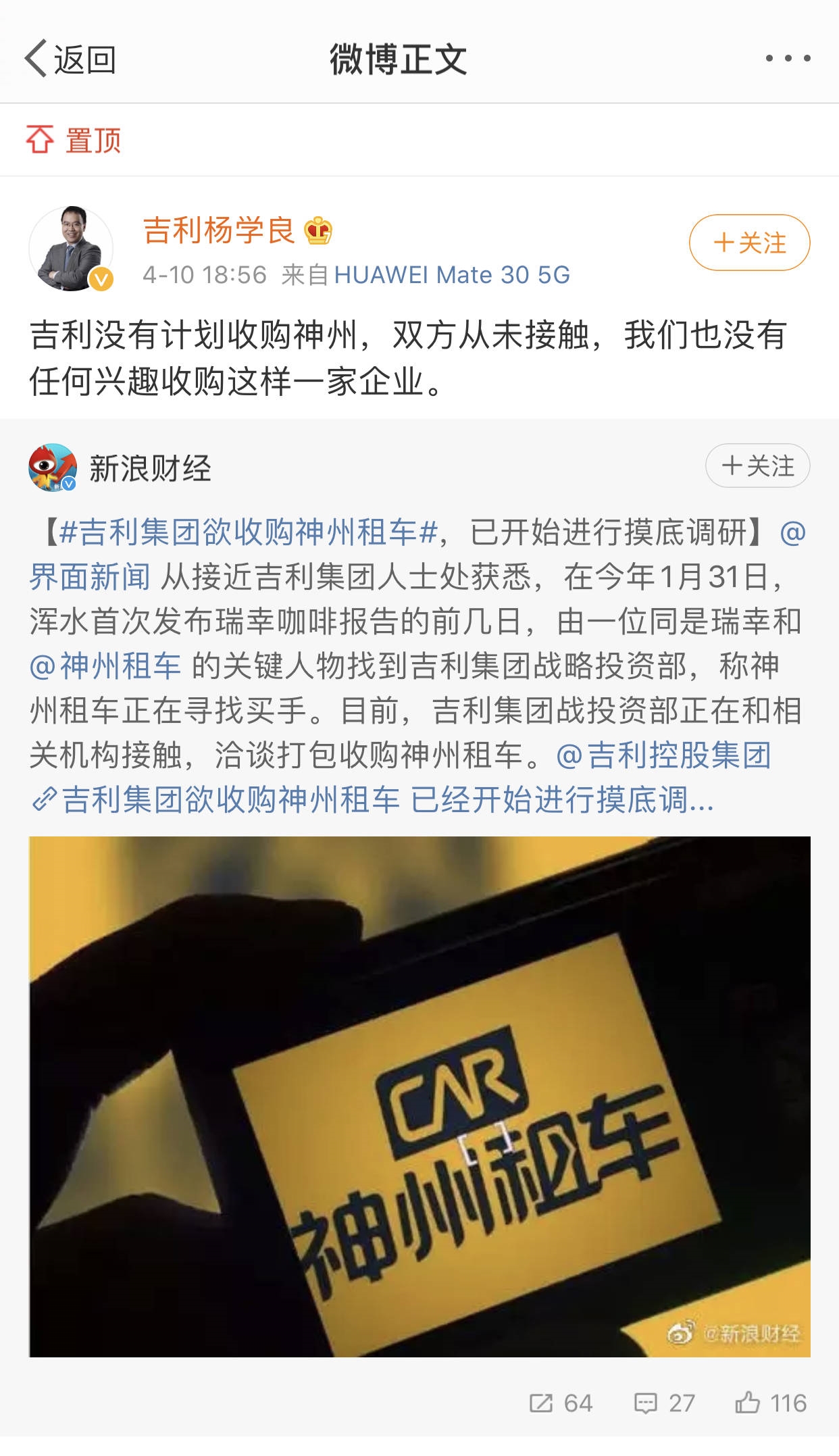 4月10日,吉利汽车集团副总裁杨学良在个人微博表示:“吉利没有计划收购神州(租车),双方从未接触,我们也没有任何兴趣收购这样一家企业。”