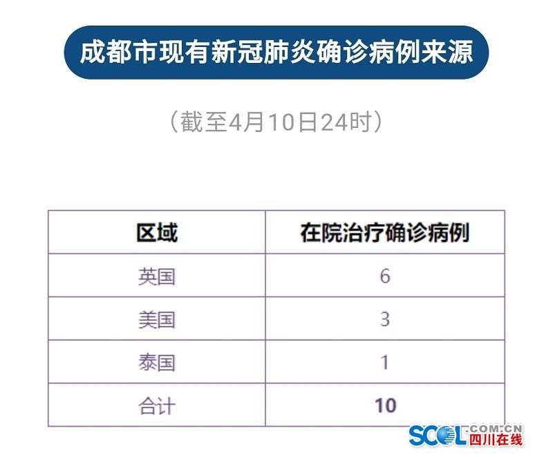 截至4月10日24时,成都市累计报告确诊病例165例,累计出院152人,死亡3人,其余10例境外输入确诊病例正在定点医院隔离治疗。全市尚在集中隔离医学观察的无症状感染者7例,其中境外输入6例。