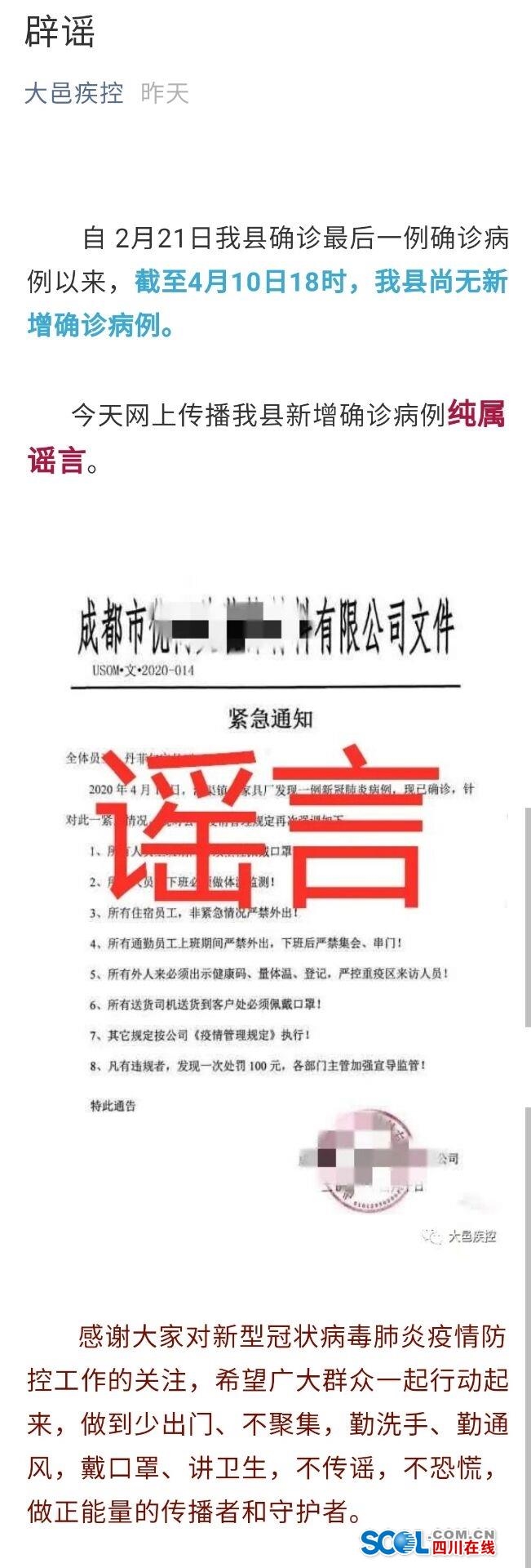 四川在线消息(记者 张庭铭 程文雯)4月11日,有网友在微博上向@四川日报官方微博反映,网传成都大邑县昨日有新增新冠肺炎确诊病例,不知真假,希望记者核实。经查,该消息为谣言。