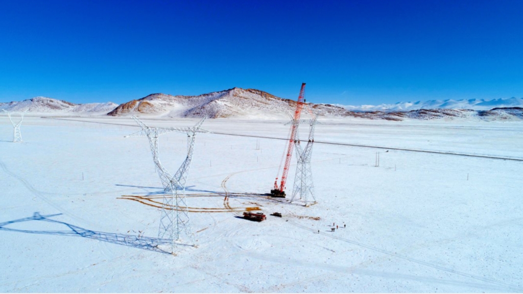 “这个大家伙,自身重量就达到了150吨。”指着眼前全高100余米的履带吊,该标段施工项目经理田维立喘着气介绍道,“我们结合高海拔高寒地带大型机械明显降效的实际情况,充分考虑安全裕度,采用150吨级的大吨位履带吊,进行平原区段铁塔组立,可以单次起吊20吨的塔材,吊起到达70米高的地方,满足我们的铁塔分段整体吊装作业要求。”