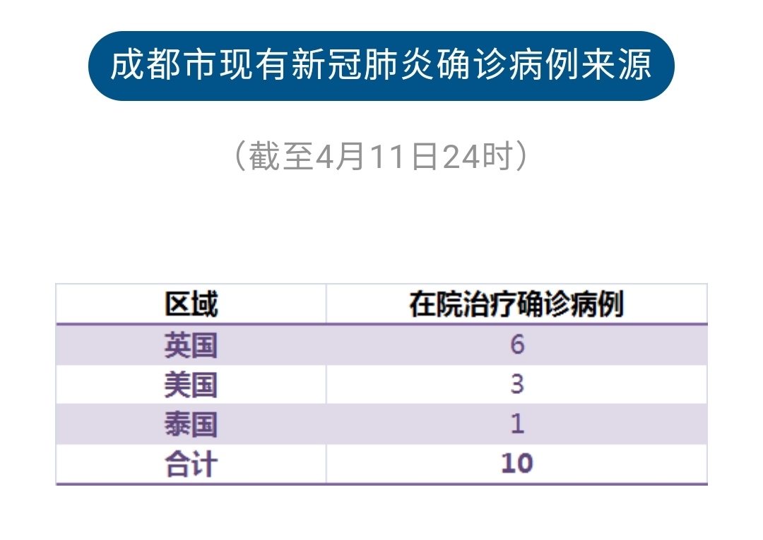 截至4月11日24时,成都市累计报告确诊病例165例,累计出院152人,死亡3人,其余10例境外输入确诊病例正在定点医院隔离治疗。全市尚在集中隔离医学观察的无症状感染者9例,其中境外输入7例。