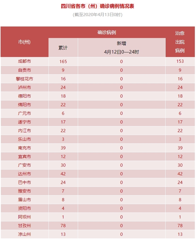 四川在线消息(记者 石小宏 殷鹏)4月13日,据四川省卫健委消息:4月12日0-24时,四川省新型冠状病毒肺炎无新增确诊病例,新增治愈出院病例1例,无新增疑似病例,无新增死亡病例。
