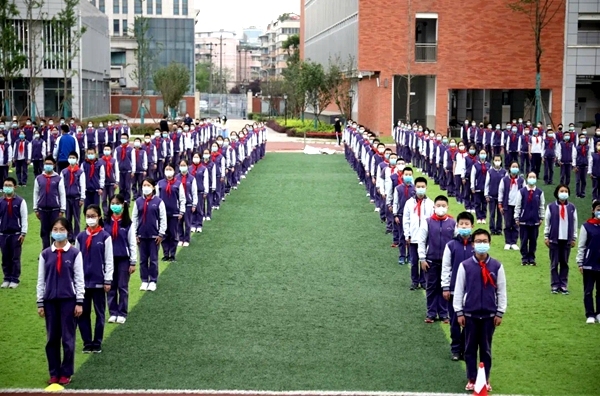 在操场上,学生与学生之间间隔两米,以确保有足够的空间间隔。
