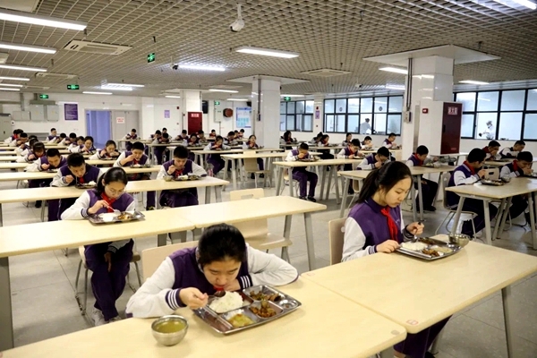 为了落实错时用餐、间隔就餐,学校提前完善食堂布置,划分用餐座位。每张餐桌上都贴好了标志,引导学生间隔就坐,单排单向就餐。1.5米的间隔,保证安全用餐距离。