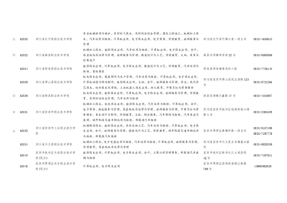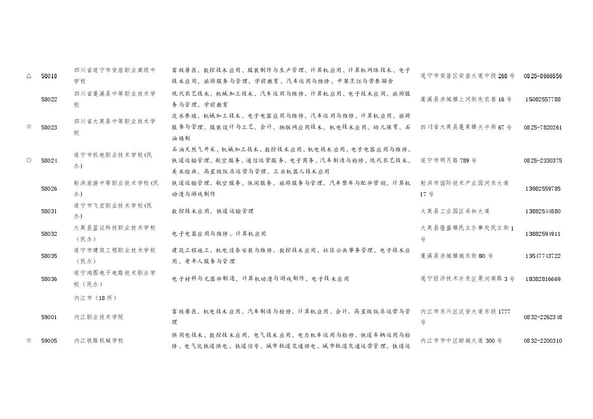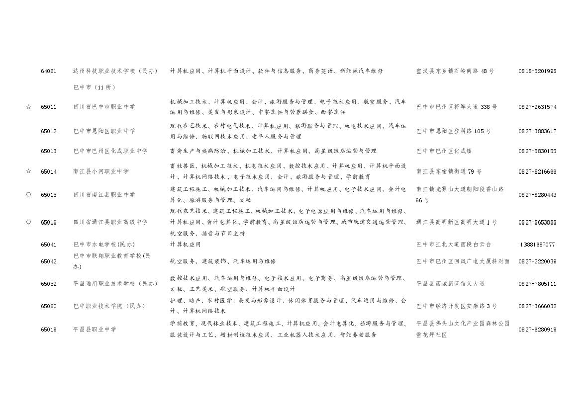 2020年具有中等职业学历教育招生资格学校457所(校名前“☆”为国家中等职业教育改革发展示范学校,“△”为国家级重点中职学校,“○”为省级重点中职学校)。其中,教育部门管理的职业学校368所,开设专业223个,开办专业点2734个;人力资源和社会保障部门管理的技工院校89所(其中,技师学院21所,高级技工学校11所,技工学校57所),开设专业155个,开办专业点835个。
