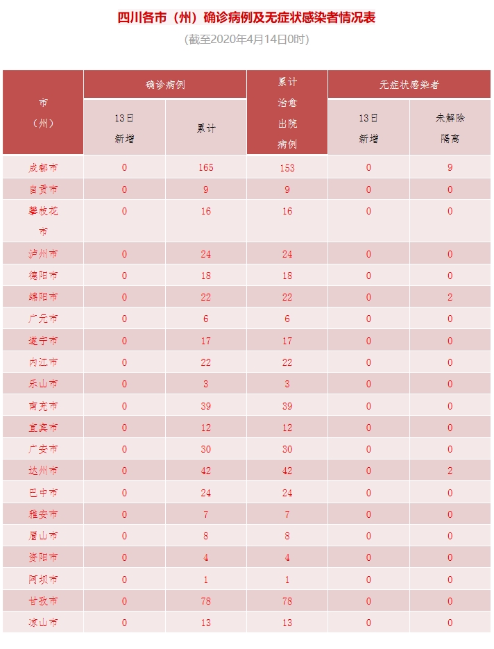 四川在线消息(记者 石小宏 殷鹏)4月14日,记者从四川省卫健委获悉,4月13日0-24时,四川新型冠状病毒肺炎无新增确诊病例,已经连续7日无新增确诊病例。无新增治愈出院病例,无新增疑似病例,无新增死亡病例。