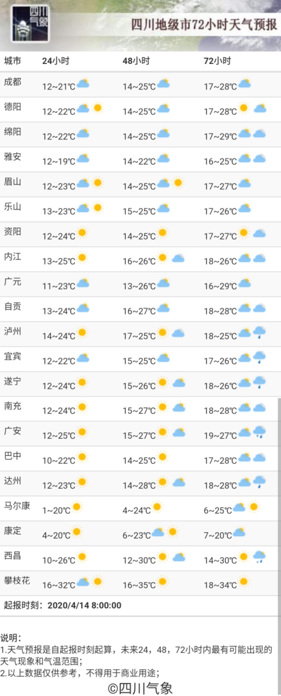 明天晚上到16日白天,盆地大部多云间晴,其中西部沿山一带有阵雨;川西高原和攀西地区晴间多云。