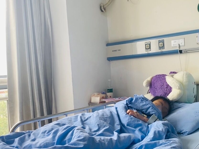 4月13日,记者在医院看到了已接受治疗2天的小美。此时,她的双眼仍有些红肿,左脚上遮有纱布,盖着被子躺在床上看电视。当被问到“痛不痛”“讨不讨厌妈妈”时,不太愿意开口说话的她,选择摇了摇头。