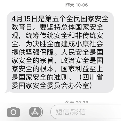 我省统一发送的短信内容为“4月15日是第五个全民国家安全教育日。要坚持总体国家安全观,统筹传统安全和非传统安全,为决胜全面建成小康社会提供坚强保障。人民安全是国家安全的宗旨,政治安全是国家安全的根本,国家利益至上是国家安全的准则。”在此基础上,各地还结合实际,协调运营商推送其他相关公益短信,如成都市通过短信告知公众国家安全人人有责,“国家安全机关受理举报电话为12339”。