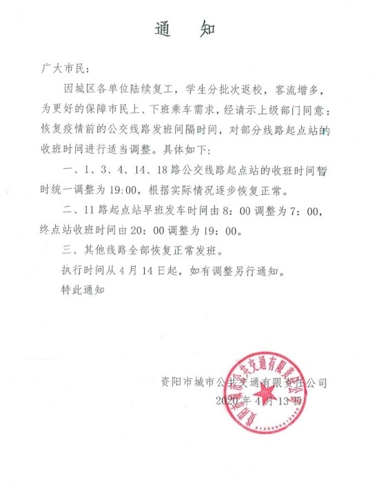 记者4月14日从资阳市城市公共交通有限责任公司获悉,从4月14日起,恢复疫情前的公交线路发班间隔时间,并对部分线路起点站的收班时间进行适当调整。