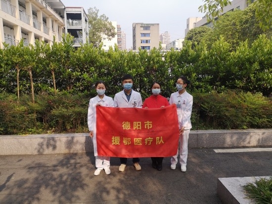 德阳市人民医院援湖北医护人员(从左至右)钟晓莉、冯银合、何清、谢艳