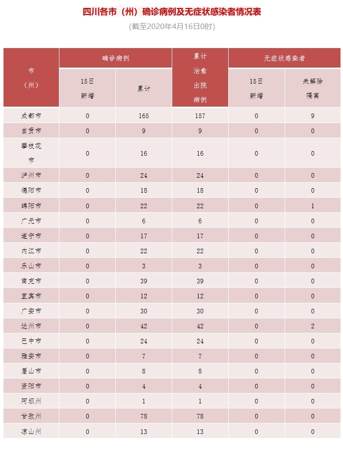 四川在线消息(记者 石小宏 殷鹏)4月16日,记者从四川省卫健委获悉,4月15日0-24时,四川新型冠状病毒肺炎无新增确诊病例,新增治愈出院病例2例,无新增疑似病例,无新增死亡病例。