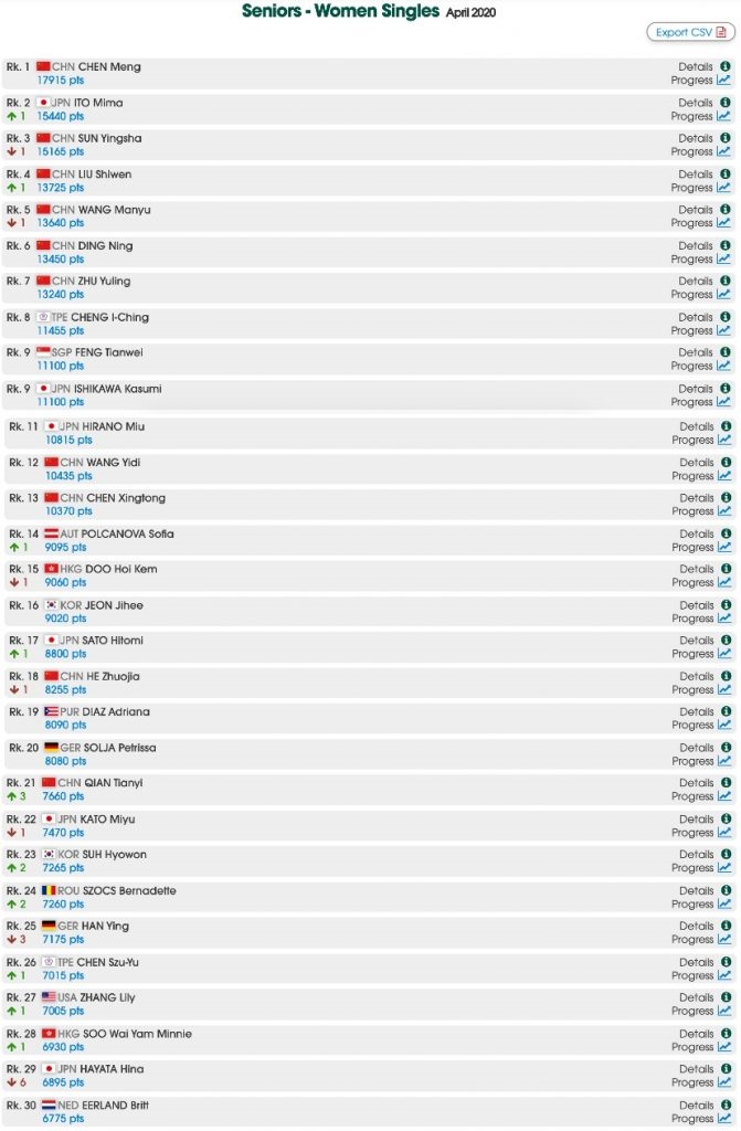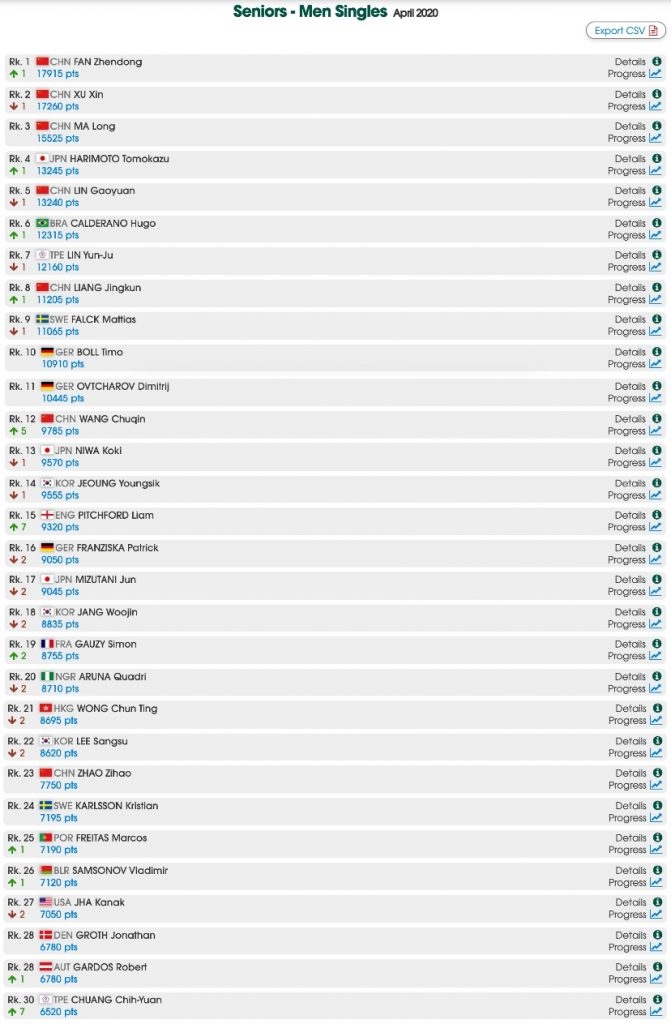 因受新冠肺炎疫情影响,目前国际乒联赛事处于停摆状态。本月世界排名将冻结,直至比赛重启。