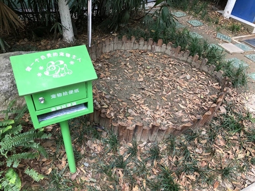 这种宠物公厕由一排木桩围成,呈一个“心”型,其中铺着沙土,木桩旁边有一个绿色的小邮箱,其上写着“做一个负责的宠物主人”,其中放着宠物拾便纸和宠物拾便袋。“这几个月来看效果越来越好,每天能清理不少,现在小区里踩到狗屎反映到我们这里来的情况大幅下降了。”该小区物管负责人表示,清理小区里的宠物粪便,一直是清洁工人的一项重点,如今有了集中的场地,不仅工作量减少了,居民的生活环境也提升了。