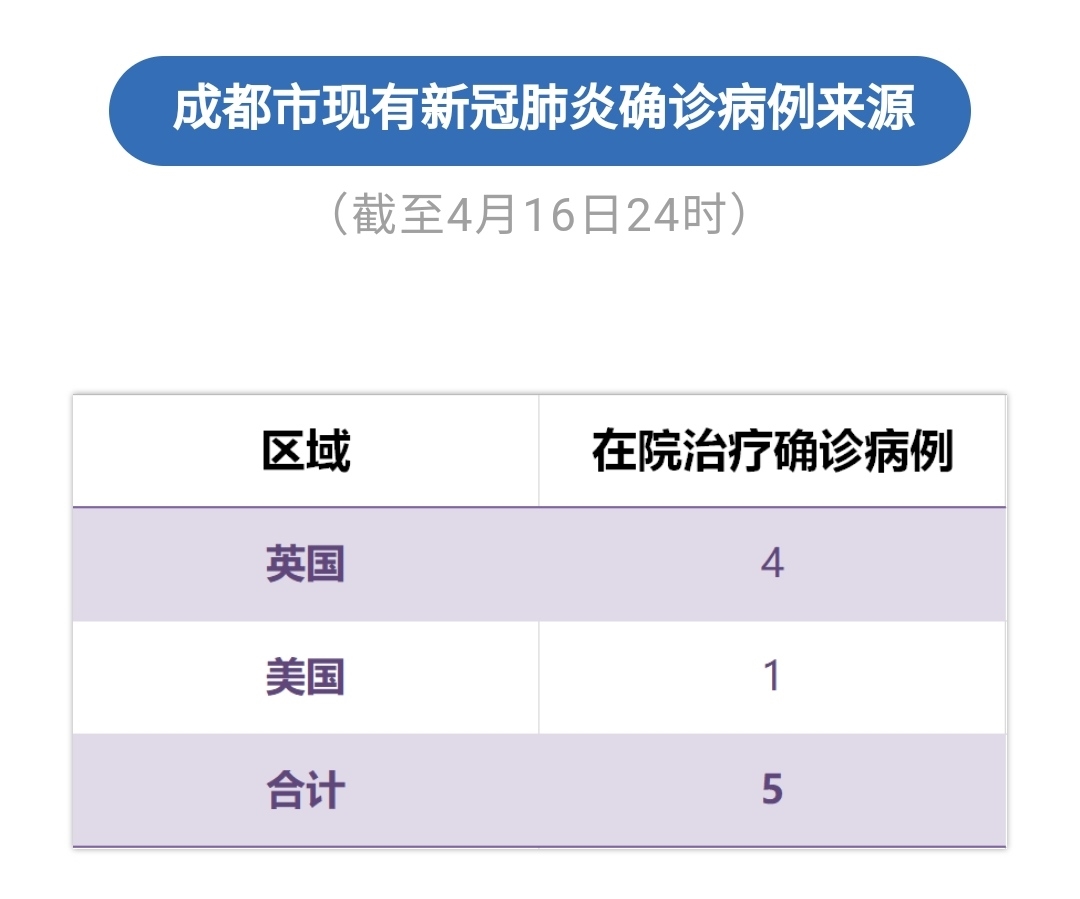 截至4月16日24时,成都市累计报告确诊病例165例,累计出院157人,死亡3人,其余5例境外输入确诊病例正在定点医院隔离治疗。