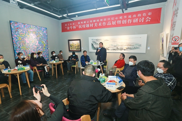 金牛区文联主席邓熠表示,自年初以来,新冠肺炎疫情的爆发使正常的社会生活受到严重冲击,四川当代书画院联合成都市金牛区文学艺术界联合会,积极行动,发动省内知名美术家、美术工作者,以笔为枪投入到万众抗疫的美术创作中,旨在通过精心的艺术创作描绘抗疫英雄人物,记录疫情中的感人故事,以艺战疫,以鲜活生动、饱含真情的艺术创作鼓舞人心。
