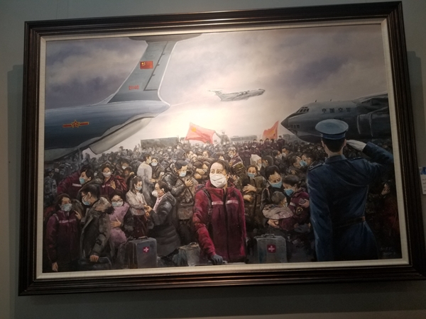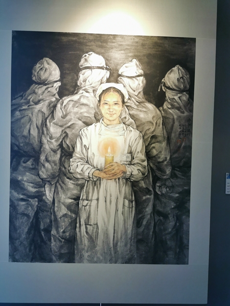 65幅画作中,入画最多的是普通医护人员,其中也有名满中华的钟南山、陈薇院士等。他们的创作大都经历了关注新闻、取材新闻图片、二度创作的三部曲,因此充满了真实感、现场感,引起了观众的共鸣和好评。