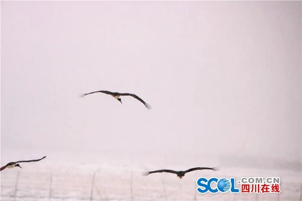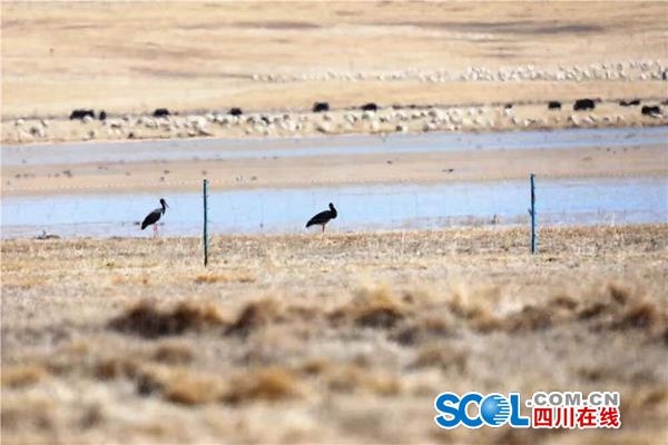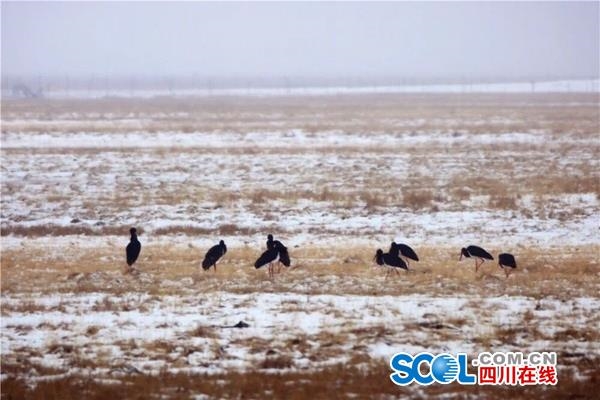 前不久,在若尔盖辖曼镇的湿地中,观鸟爱好者惊喜的发现数量多达24只的黑鹳种群。这种水鸟双腿细长,腿与嘴都为红色,全身长满黑色羽毛,腹部为白色。它们经过长途迁徙后,时而在雪地中休憩觅食,时而与赤麻鸭、灰雁等鸟类振翅高飞,同周边的湿地、草甸构成和谐舒美的立体画卷。