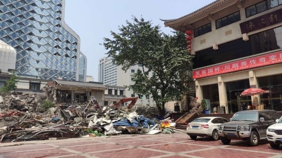 4月17日中午,记者路过华兴正街的锦江剧场发现,位于剧场西侧的悦来茶馆已堆满土石和杂物,一旁橙色的挖掘机正在施工,依稀能在废墟上分辨出原悦来茶馆的八字青瓦屋顶。“疫期剧场一直关闭,悦来茶馆目前正在重新打造。”施工现场的工作人员说道。