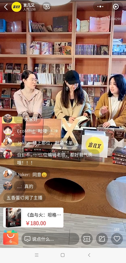 四川在线消息(记者 边钰)当《冰与火之歌》系列图书走进直播间会发生什么奇妙化学反应?4月18日,下午三点,由言几又策划的《冰与火之歌》系列新书首发&直播分享会在线上如期与书迷相约。独角兽书系核心成员唐弋淄、方媛、唐凌现身直播间,在一个半小时的线上分享里,和1600余名读者畅聊西方奇幻文学,探讨阅读里的”吃鸡“感受,更有三轮有关《冰与火之歌》的抽奖活动,让轻松的阅读分享多了一份拼手速的紧张刺激。