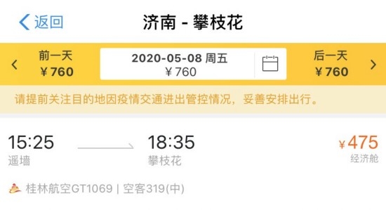 攀枝花—济南航线,航班号为GT1069/GT1070,计划班期为每周五、日,执飞机型为空客A319,由桂林航空公司执飞,票价为475元