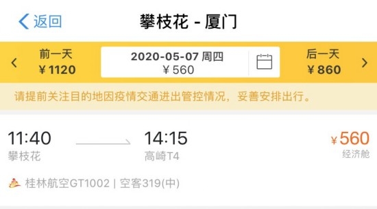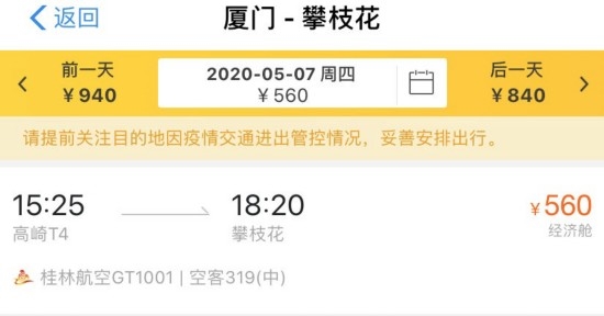 攀枝花—厦门航线,航班号为GT1001/GT1002,计划班期为每周四、六,执飞机型为空客A319,由桂林航空公司执飞,票价为560元。