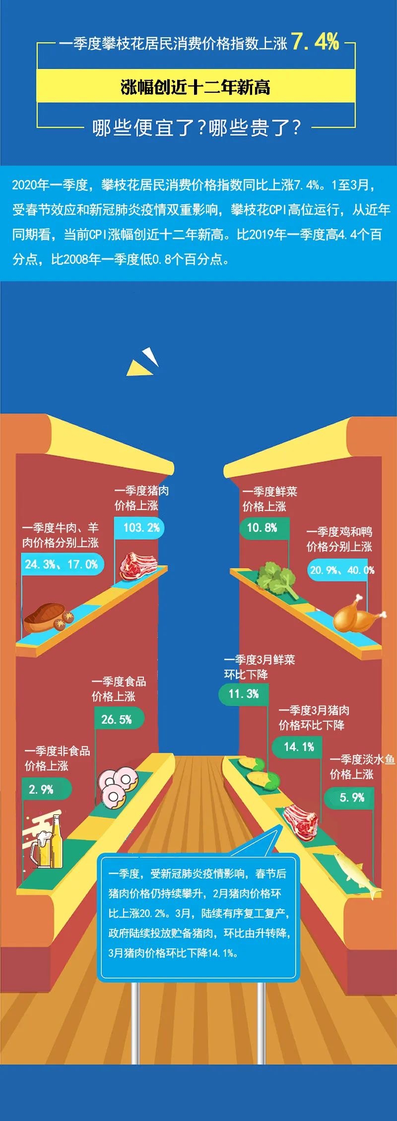 四川在线消息(苏兴国 记者 唐子晴)4月20日,记者从国家统计局攀枝花调查队获悉,2020年一季度,受春节和新冠肺炎疫情双重影响,攀枝花CPI高位运行,同比上涨7.4%,高于全国(4.9%)和全省(6.2%)平均水平,涨幅创近十二年新高。