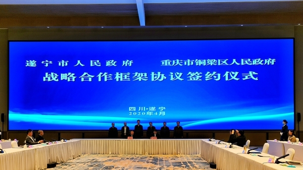 四川在线消息(记者 王若晔)4月21日,遂宁市与重庆市铜梁区在遂宁签署战略合作框架协议。双方约定将在基础设施、产业协同、招商引资、科技创新等10个方面深化战略合作,携手提升两地营商环境,构建协同高效的机制体制格局,推动成渝地区双城经济圈建设。