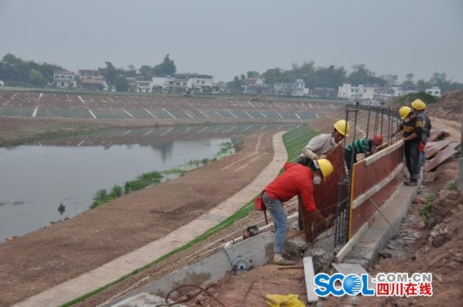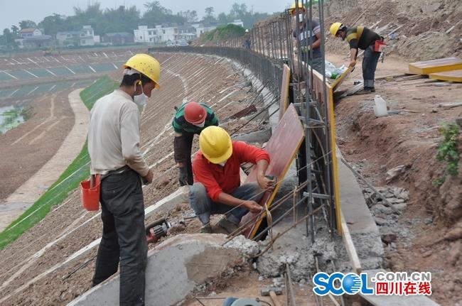 在泸县嘉明镇河段施工现场,工程施工单位的2台挖掘机正在进行河堤造型和河道开挖作业,同时进行防浪墙浇筑、堤顶路浇筑等施工,现场呈现一派忙碌的景象。工程河段共分三段,包括嘉明镇段、鲜花园至龙滩大桥段、港城大道至彩虹桥段。