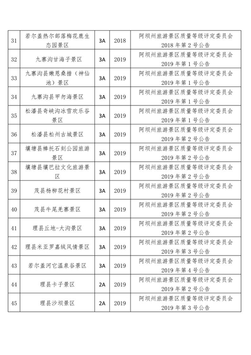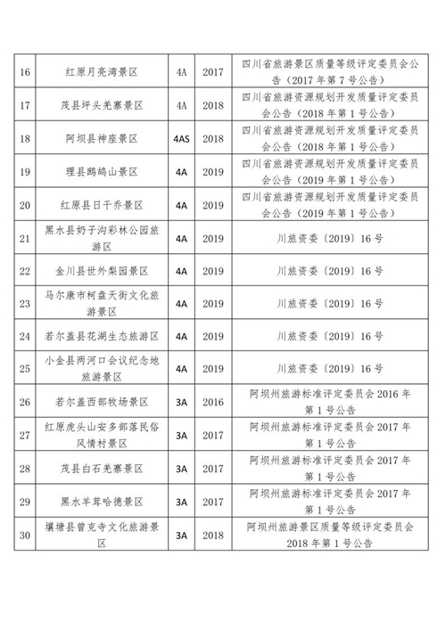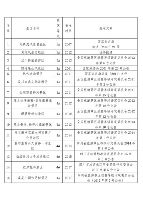 旅游资源普查结果显示,阿坝州目前A级景区达45个。其中,5A级景区3个,4A级景区22个,3A级景区18个,2A级景区2个,具体分布情况见附表。