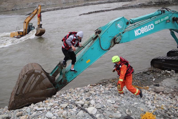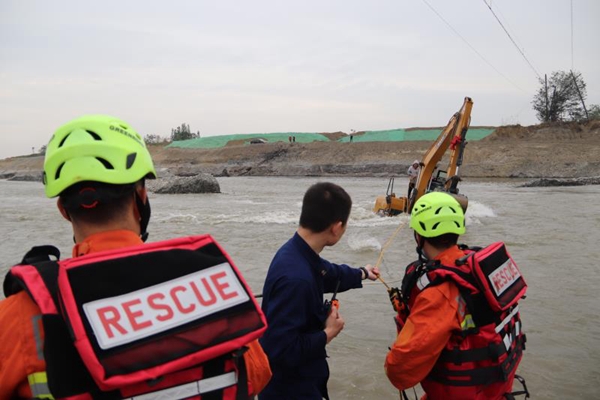 随后,消防员立即展开救援,结合现有装备和场地实际,将救援绳索扔向被困挖掘机,用救援绳将专业救生衣送到被困人员处,让被困人员穿上。9时10分,救援挖掘机到场,将铲斗伸向被困驾驶员,待后者爬上操作臂后,将其安全送往岸边。