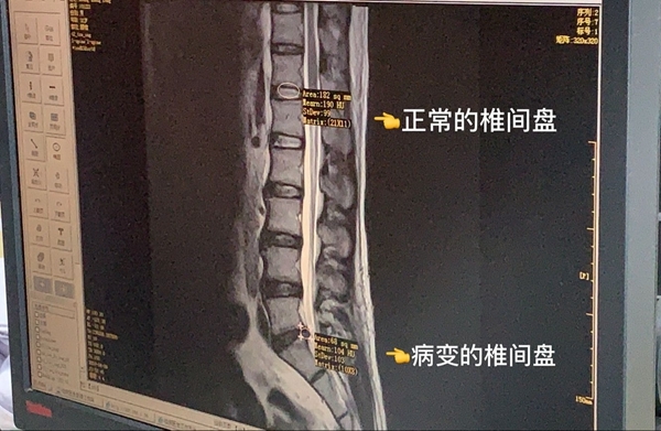 黄胜龙做了核磁共振检查,腰痛的原因一目了然了。“正常人的两节腰椎骨中间,有一块圆圆的软垫,外周由一层像橡皮筋一样的纤维环固定住,避免两块椎骨直接碰撞和摩擦,这就是我们的椎间盘!。”成都市第二人民医院骨科主治医师李庆说,“一旦外界对腰椎间盘产生压力导致中间的髓核组织和外周纤维环破裂,髓核顺着破裂的口子掉出来,突出的部分就可能压迫椎管神经造成疼痛。”