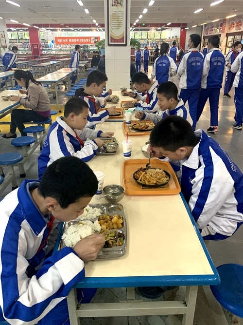 为疏散人流,成都市航天中学特意在食堂设置了三个入口,每个入口间有50米左右的间距。“学生分为两个批次就餐,同一个批次的三个年级学生再通过三个入口分别进入。”吴渝说。在入口处,该校还制作了“疫情期间食堂就餐区及通道分布示意图”,详细标注出了每个班级用餐路线、座位分布等信息。