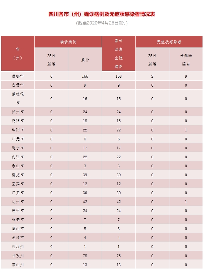 四川在线消息(记者 石小宏 殷鹏)4月25日0-24时,四川无新增新型冠状病毒肺炎确诊病例,无新增疑似病例,153人尚在接受医学观察。