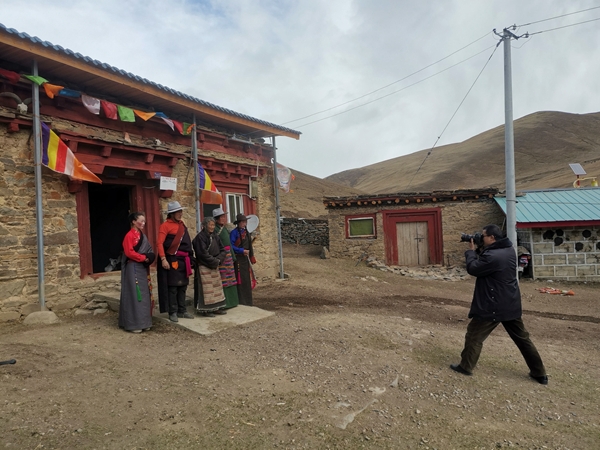 四川电大派驻干部陶军正在为村民白玛达吉一家拍摄全家福