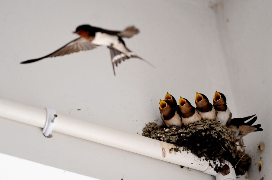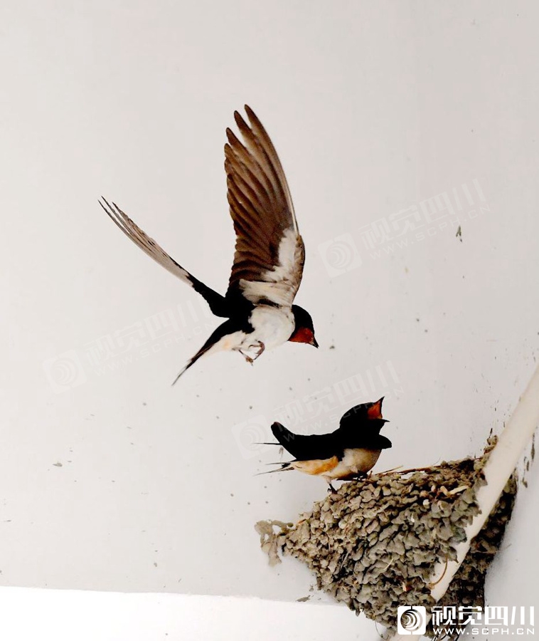每天,燕子在外觅食往返频繁,喂养春天新出生的小燕子。而小燕子们则驻守巢中,叽叽喳喳呼唤不停,焦急的等待它们的父母的觅食回家,给它们喂食。气候宜人的成都让南归燕们在此过上安逸幸福的生活。
