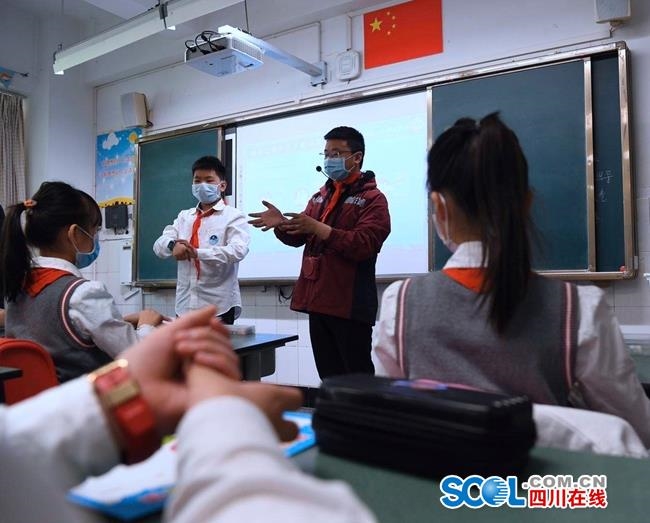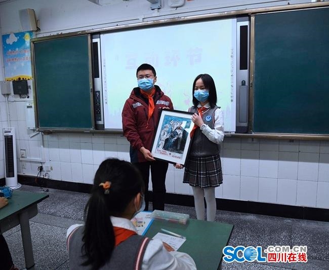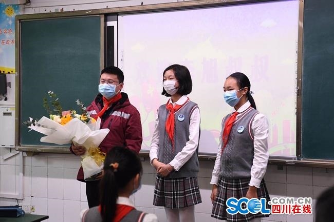 在盐道街小学六四班的特色复学礼上,抗疫凯旋的英雄———来自四川大学华西第二医院小儿感染科的李旭叔叔来到班级,和孩子们共同上课。2月13日,李旭作为四川省第八批援助湖北医疗队员,驰援武汉,负责院感防控工作。李旭叔叔给孩子们分享了他在武汉抗疫一线的精彩故事,教给孩子们七步洗手法、安全戴口罩等一些精准的防护措施,并且鼓励孩子们勇敢前行,安心复学。